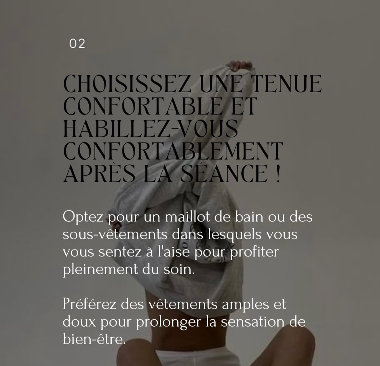 Porter des vêtements amples et confortables avant et après un drainage permet de ne pas comprimer la circulation lymphatique stimulée pendant le soin.