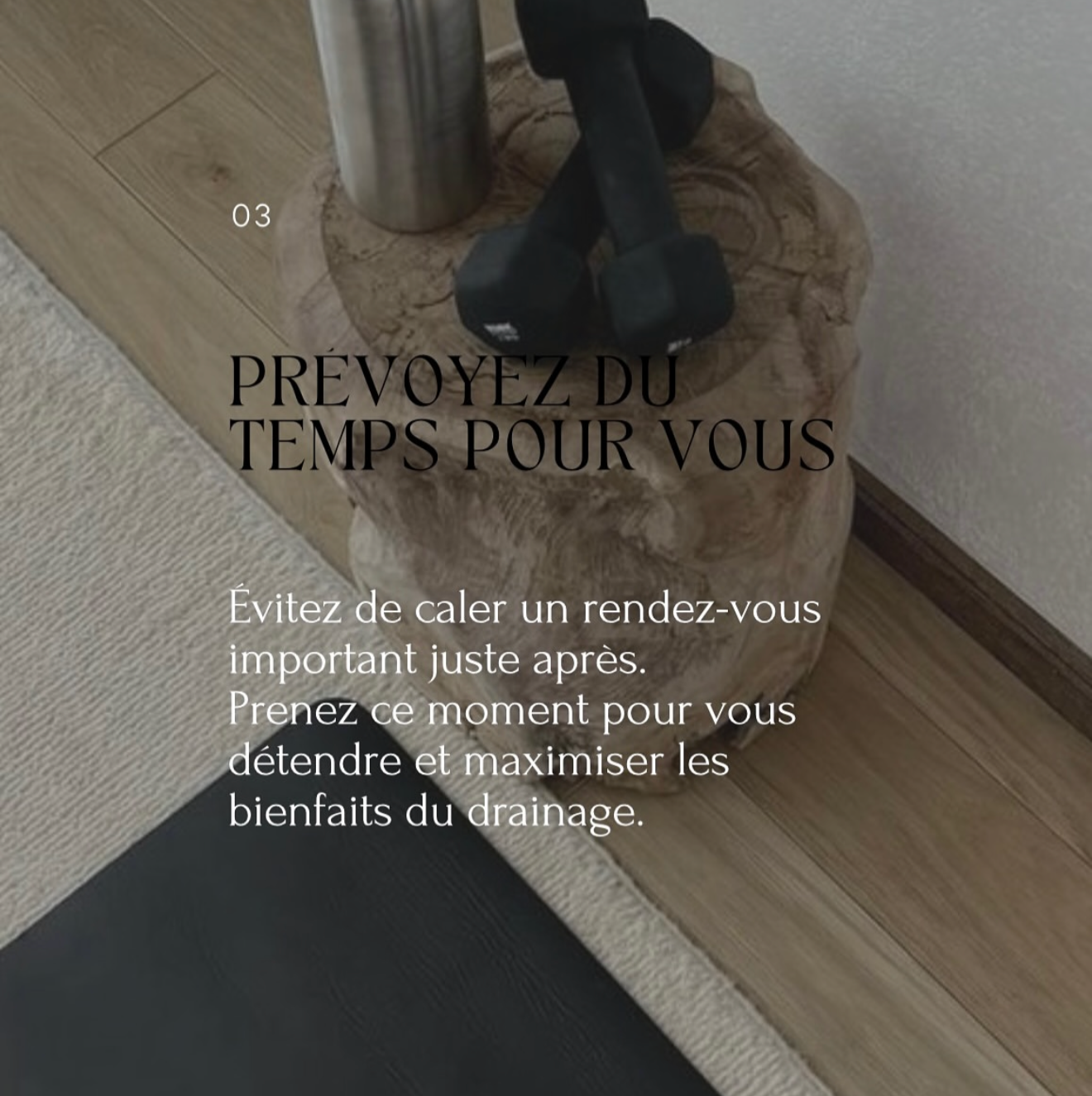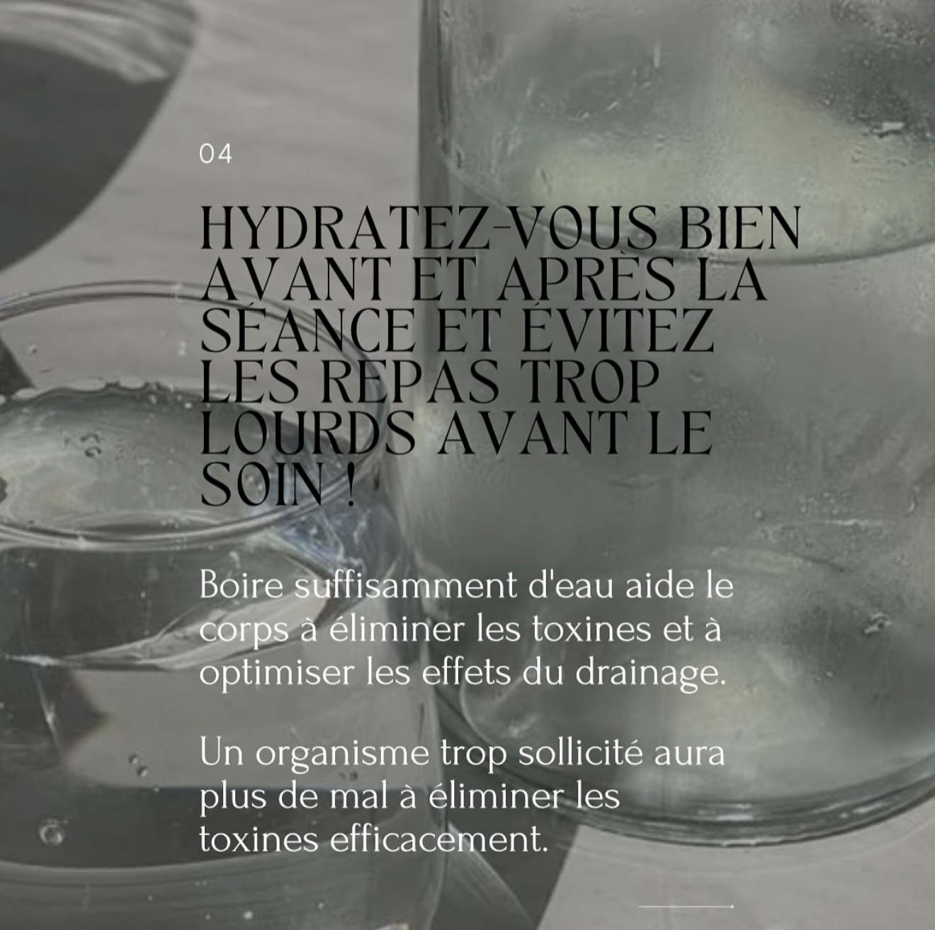 Après une séance de drainage, boire suffisamment d’eau aide à éliminer plus rapidement les toxines mobilisées et à soutenir le travail du système lymphatique.